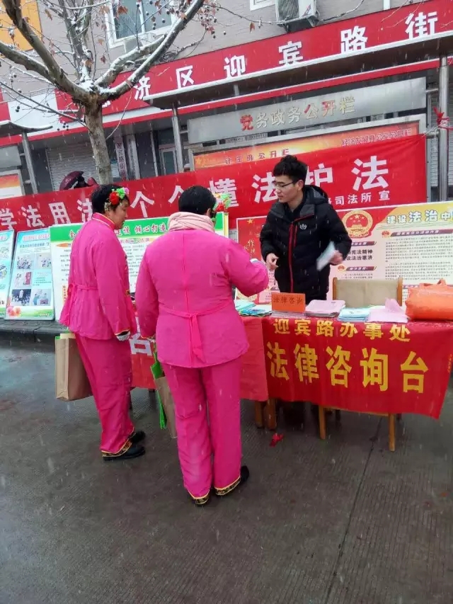 迎着寒冬风雪,踏着鸡年意犹未尽的年味,迎宾路街道办事处第十四届民间文化艺术节顺利召开,街头舞龙狮、秧歌伴舞、走高桥、航模空中翻跟头等精彩绝伦的演出,在经过9个村(社区)近4个小时的热烈表演,在2月8日写下了华丽的篇章。迎宾路司法所利用这个机会,联合综治办、信访办在演出之前早早的准备上宣传用品,准备发动新年的第一次大规模宣传,现场我们准备了法治宣传读本、法治漫画书、非法集资危害宣传页,七五普法相关展板,同时发放抽纸、手提袋等宣传品,周边的群众对我们利用演出机会做好法治宣传给予极高评价,既可以看群众的表演,还可以学习法律知识,可谓一举两得。在本次活动过程中,我们发放宣传页近400份,法治书籍200本,悬挂条幅2条,展板2块,抽纸及手提袋近500份,对辖区7个村2个社区进行了全民的法治普及,受益群众数千人。